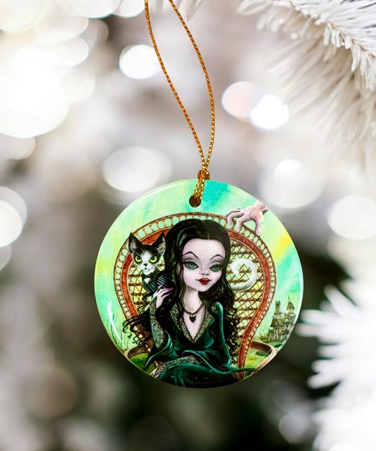 ORNAMENT Porcelain 3"x 3" Round "Morticia and Her Cat Gomez"