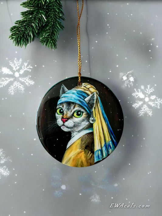 ORNAMENT Porcelain 3"x 3" Round "Cat With a Pearl Earring"