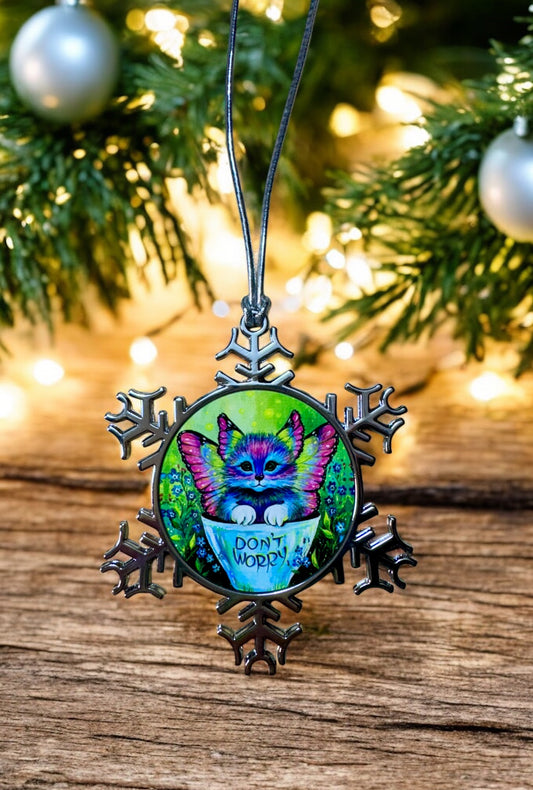ORNAMENT 3"x 3" Silver Snowflake "Don't Worry" (Image on both sides)