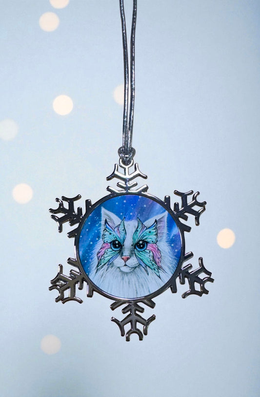 ORNAMENT 3"x 3" Silver Snowflake "Lucy Cat" (Image on both sides)