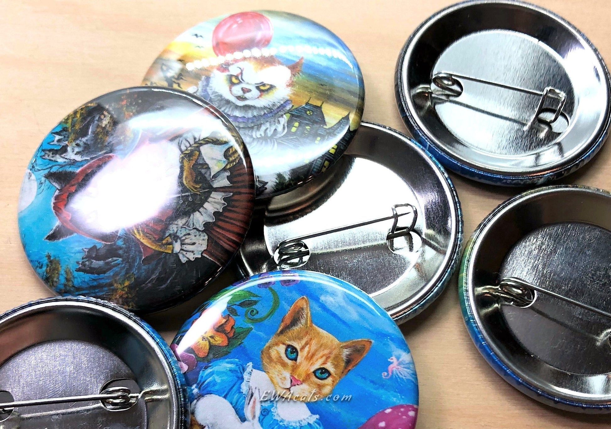 1.75" metal pinback buttons with the images of my artwork. We make art buttons ourselves in our studio, so almost all the images of my art are available!