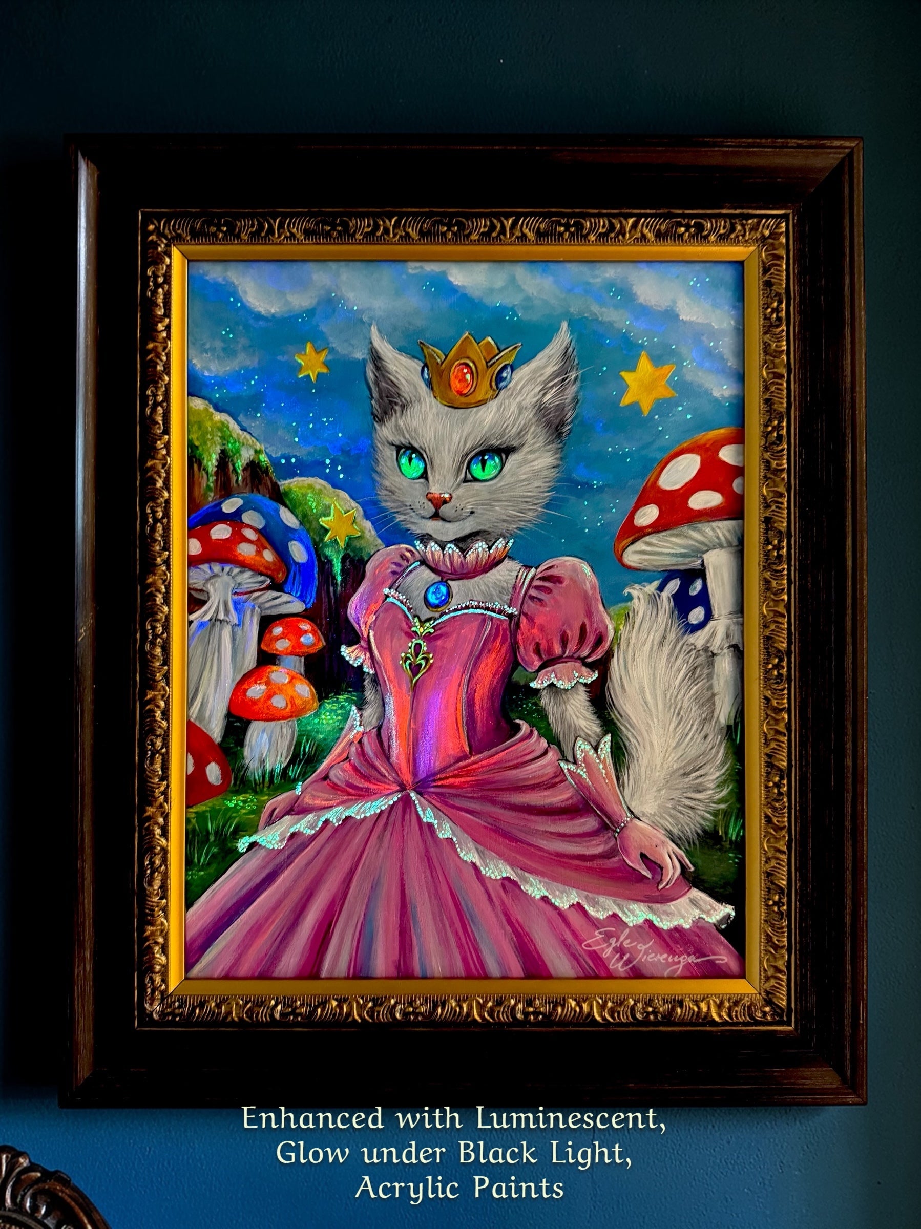 Enhanced with GLOW IN BLACK LIGHT & IN THE DARK UV-reactive paint makes the artwork glow under blacklight. This special symbolic technique enhances the mystical and supernatural quality of the art