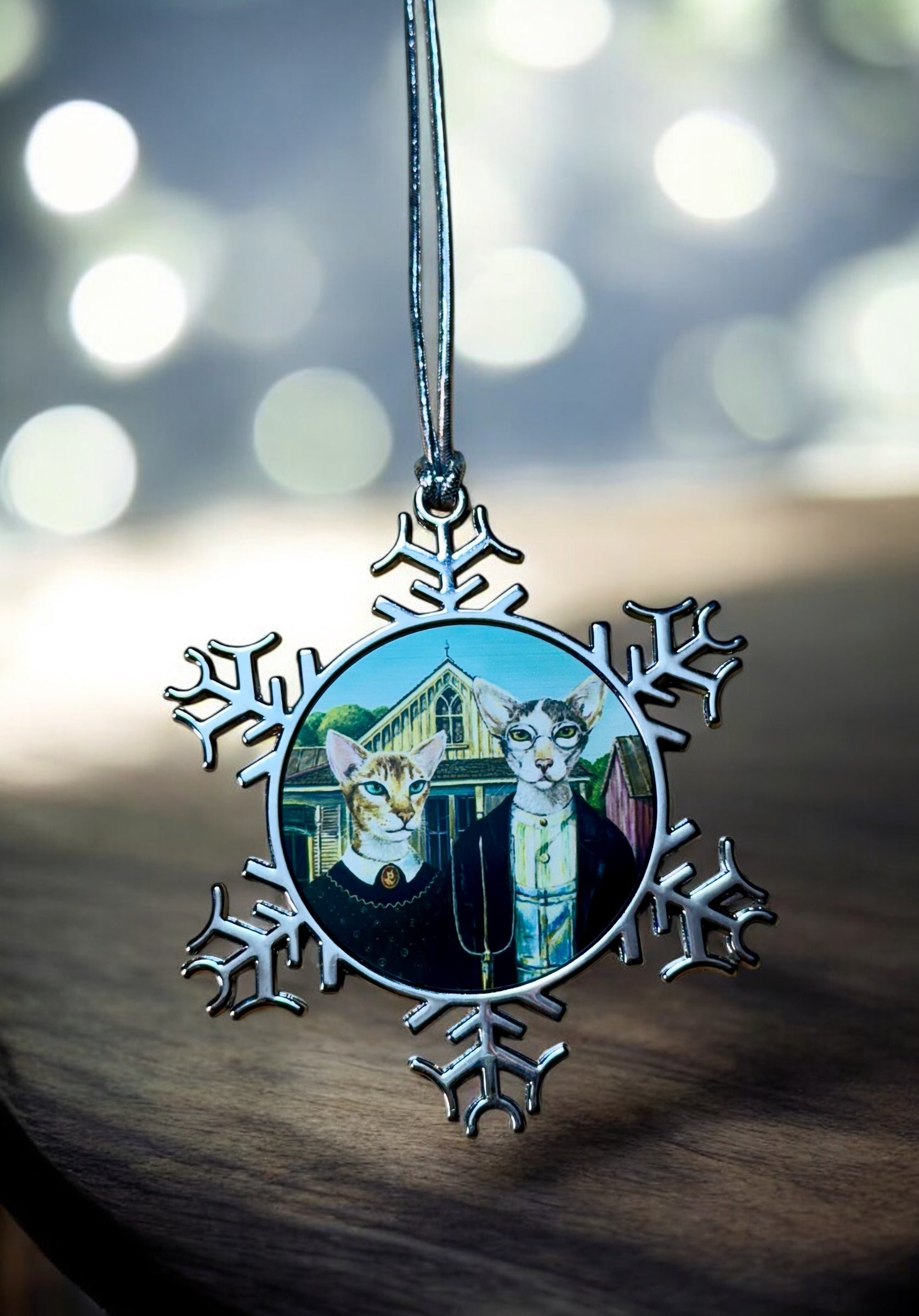 ORNAMENT 3"x 3" Silver Snowflake "AmeriCat Gothic" (Image on both sides)