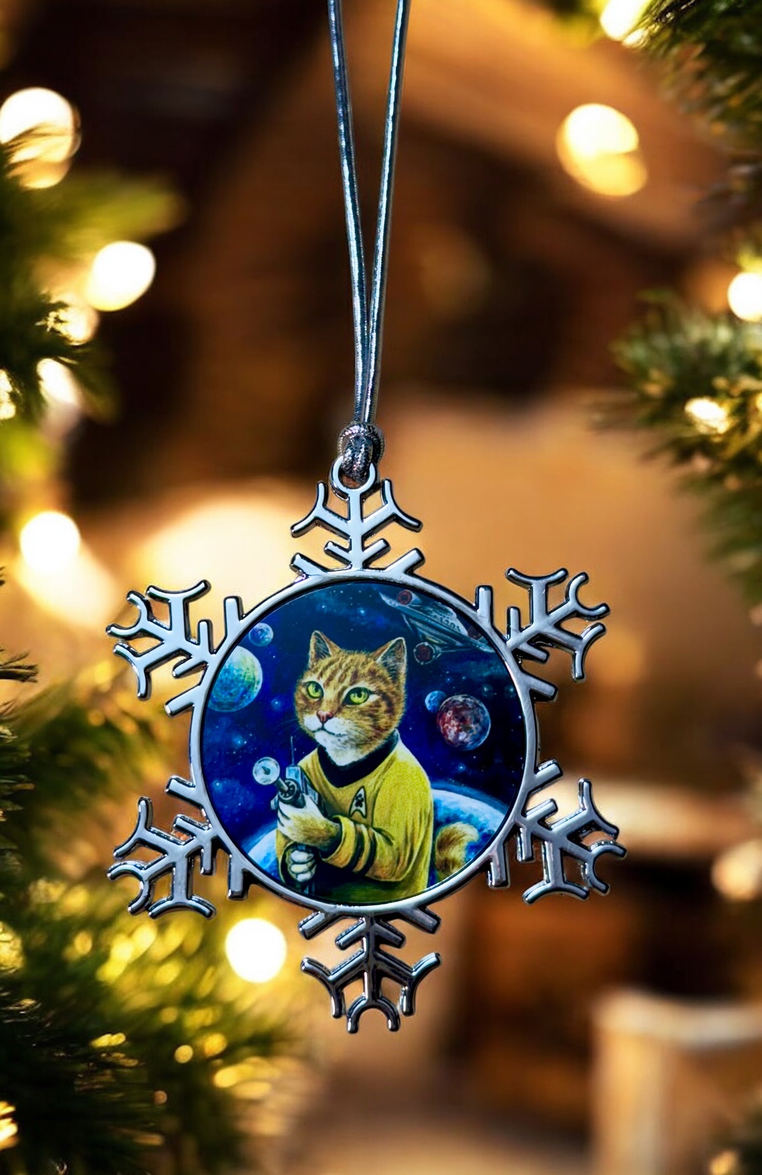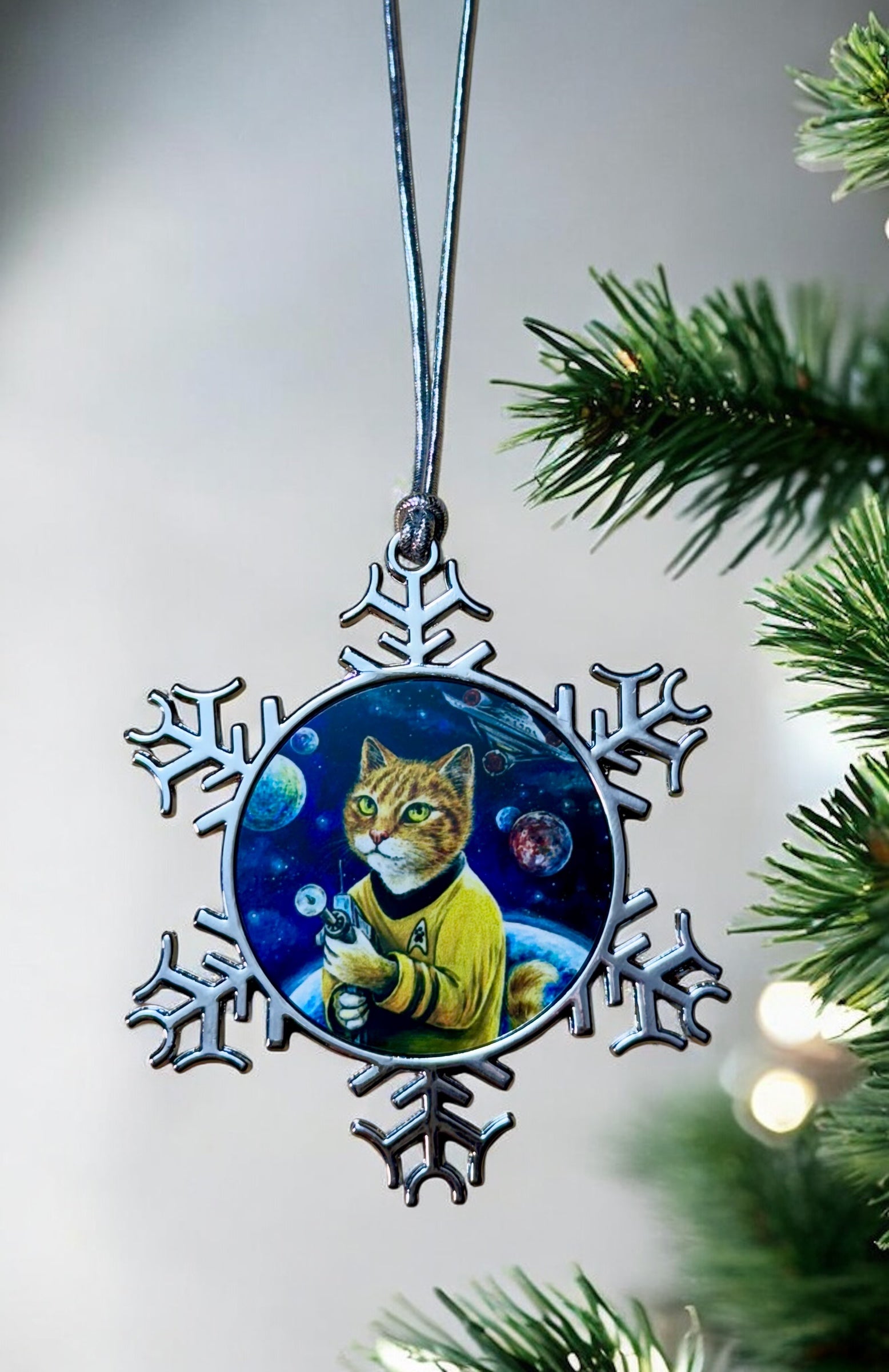 ORNAMENT 3"x 3" Silver Snowflake "Cattain Purrk" (Image on both sides)