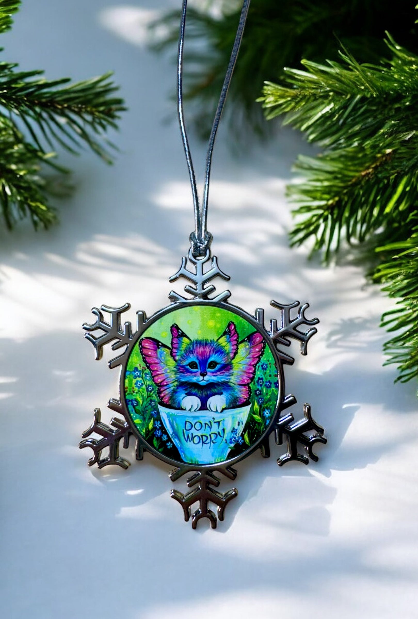 ORNAMENT 3"x 3" Silver Snowflake "Don't Worry" (Image on both sides)
