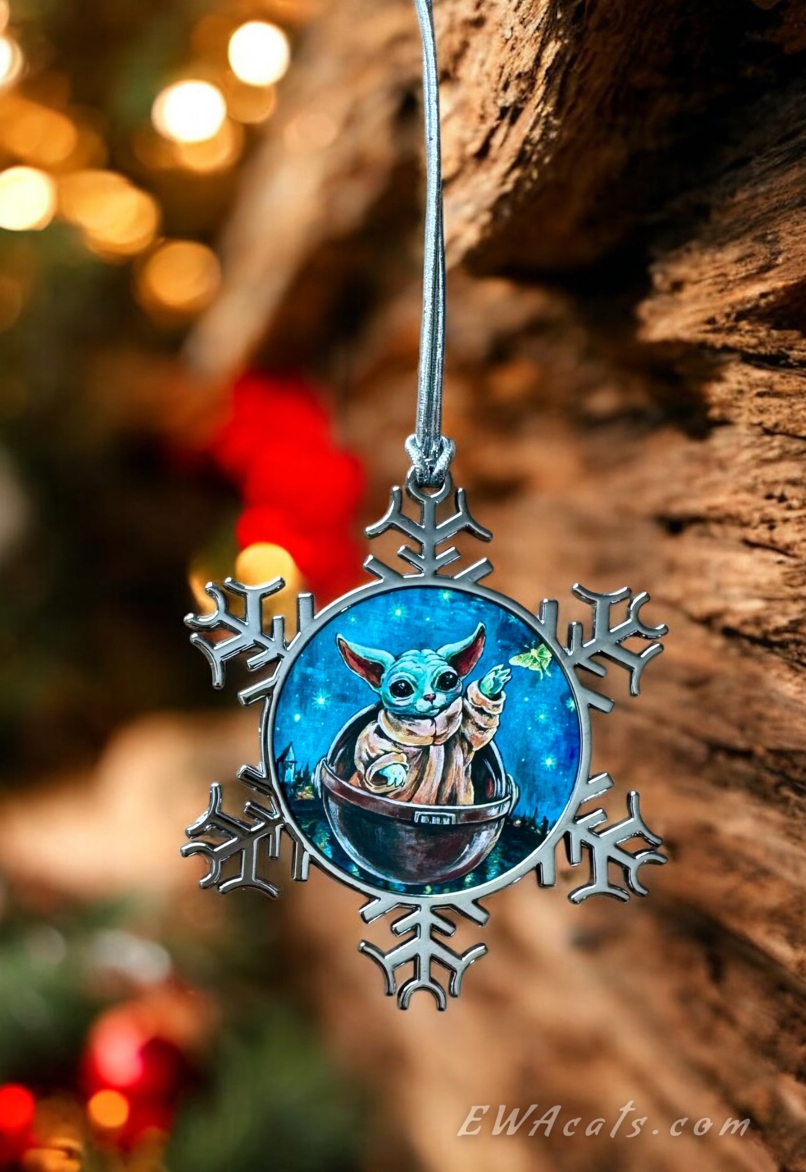 ORNAMENT 3"x 3" Silver Snowflake "Kitty Yoda" (Image on both sides)