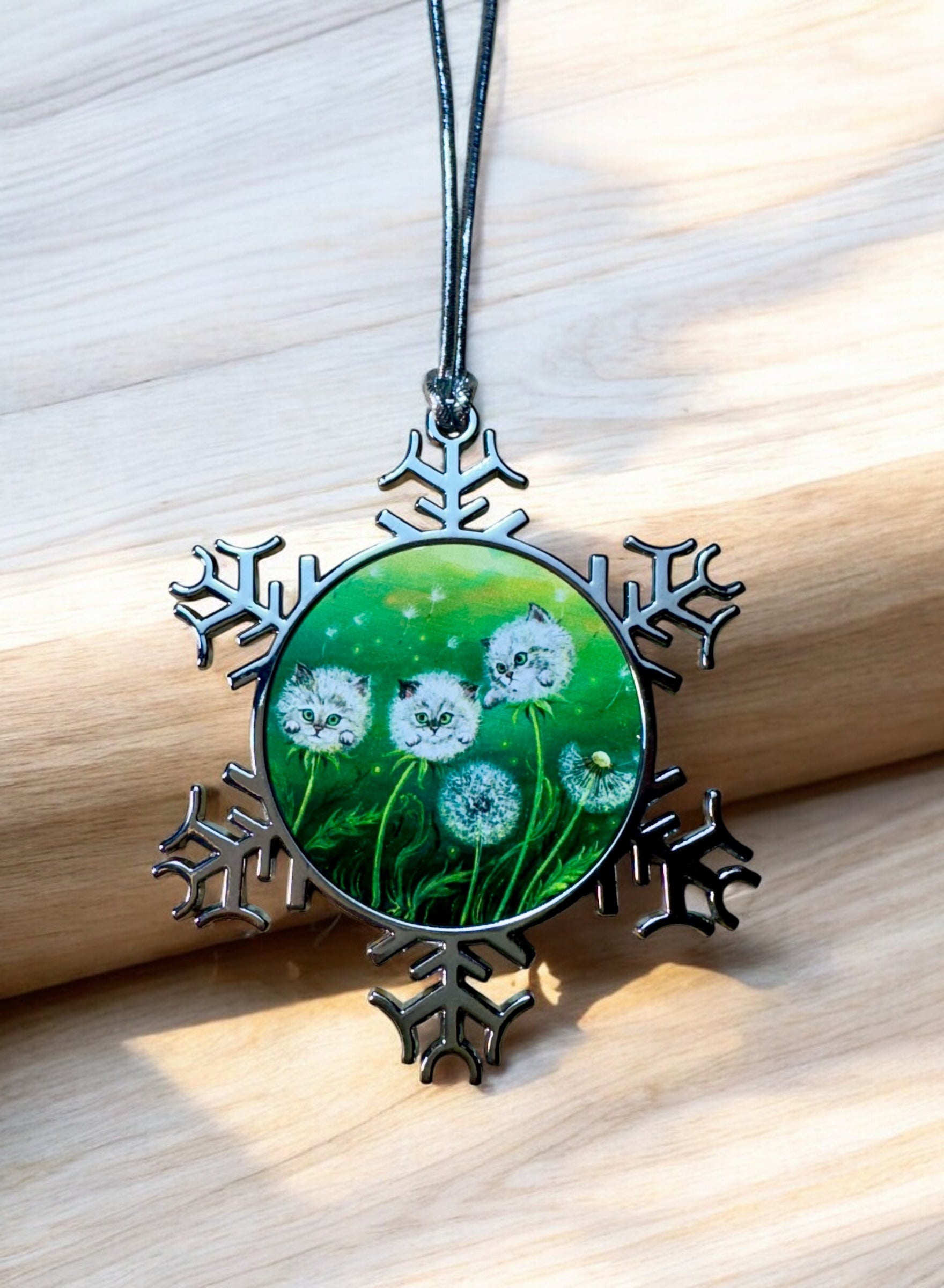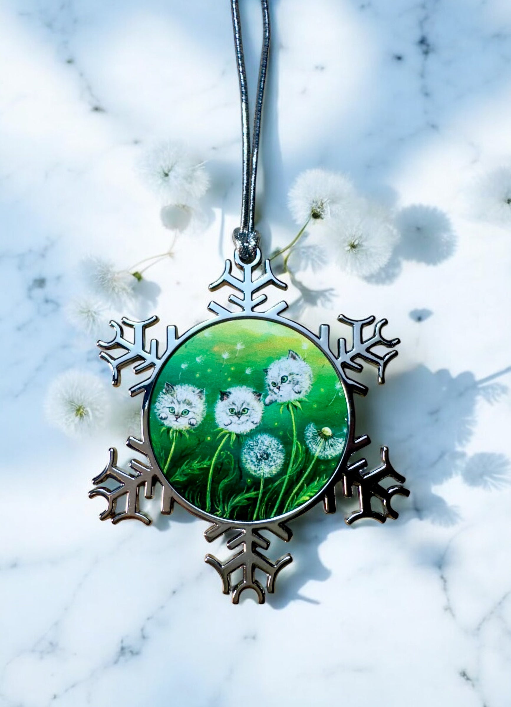 ORNAMENT 3"x 3" Silver Snowflake "Kittylions" (Image on both sides)