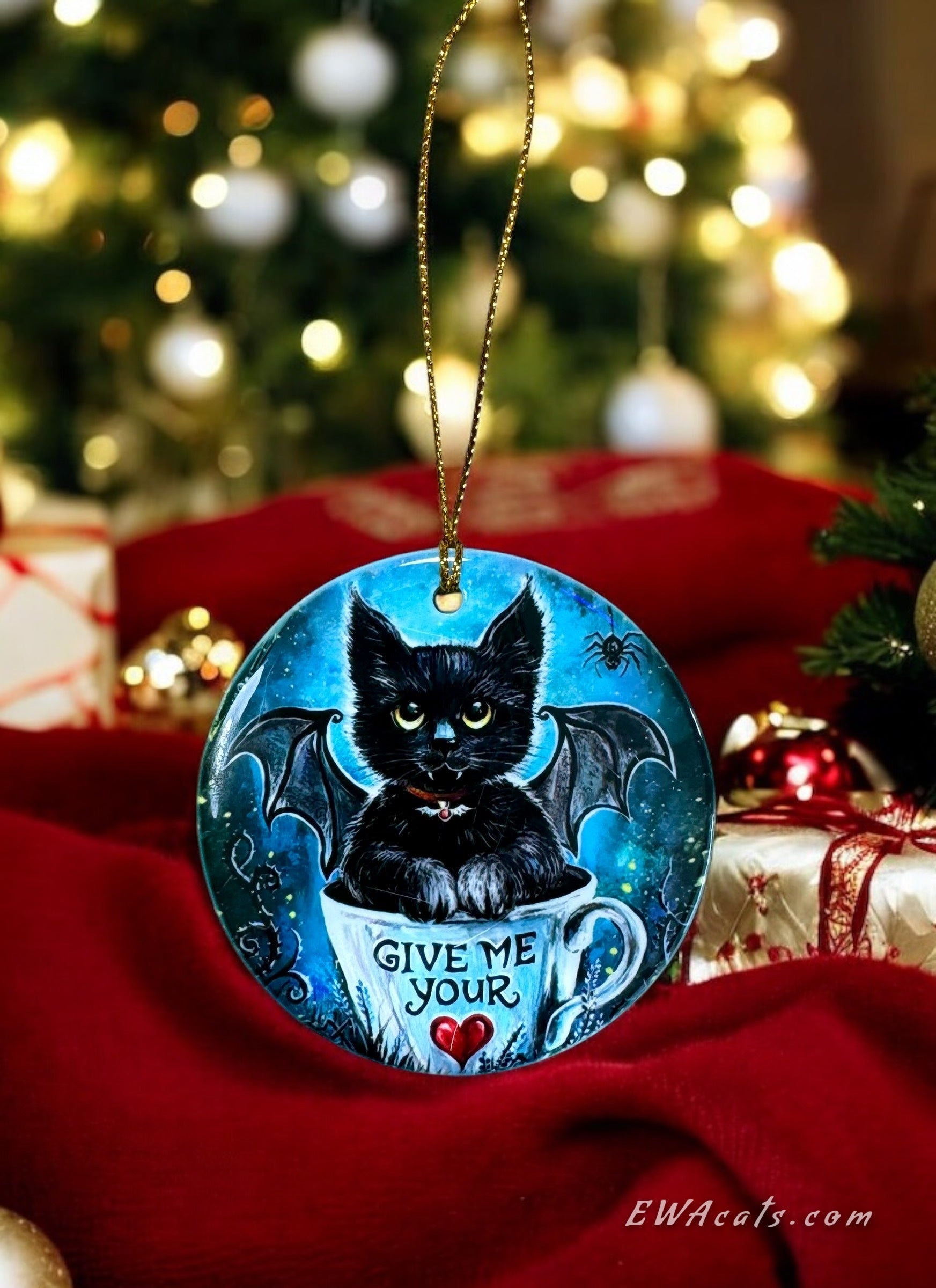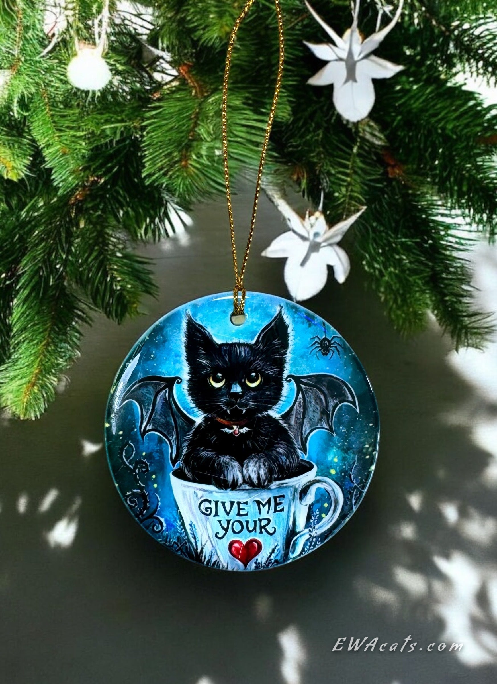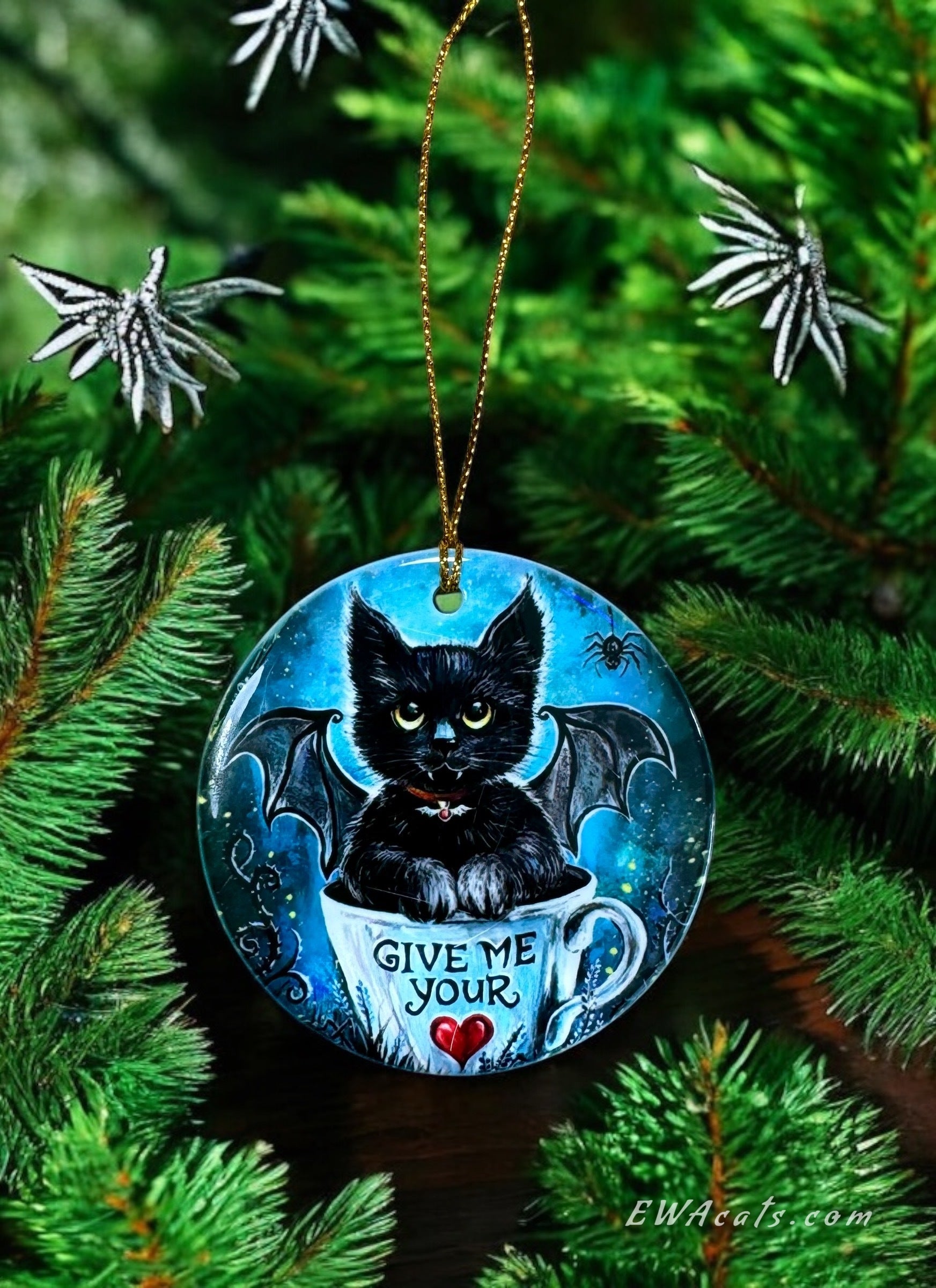 Our 3" x 3" Round Porcelain Ornaments are handmade from my original paintings, with sharp, vibrant details. The image is printed on one side while the other side showcases our beautiful logo with a heart and cat pawprint.